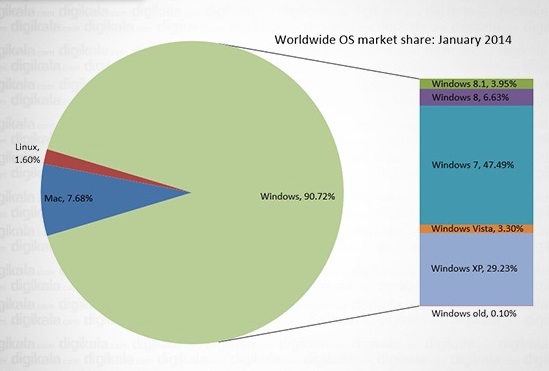 بر اساس آمار و اطلاعاتی که مرکز تحقیقاتی Net Applications منتشر کرده، در اولین ماه سال 2014، ویندوز همچنان با 90.72% بیشترین سهم بازار سیستم عاملهای دسکتاپ در اختیار دارد. سیستم عامل Mac با 7.68% و لینوکس با 1.6% در رده های بعدی قرار گرفته اند.